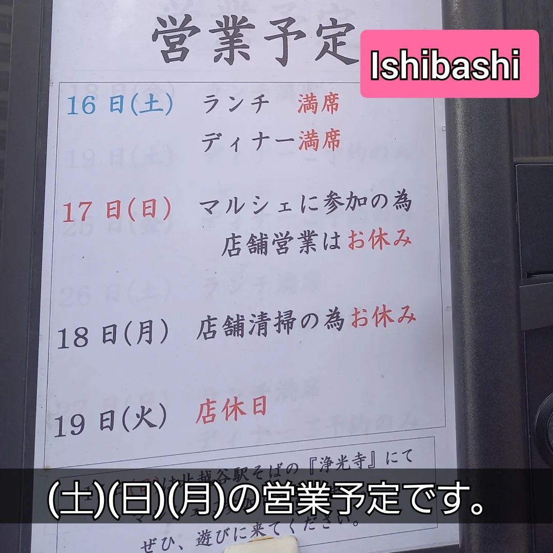 本日16日(土)はランチ・ディナー共に満席となっております。 明日17日(日)は『ふれあいマルシェin 浄光寺』に参加の為、お店の営業はお休みです。 18日(月)は店舗清掃の為、お休みです。 19日(火)は店休日です。 @nouvellechino.ishibashi 『Ishibashi』は北越谷駅から徒歩14分。 モダンな雰囲気の中、ヌーベルシノワスタイルの本格中華料理が堪能できます。ランチはリーズナブルなセットからコースまで、ディナーはご予約制で当日ご予約もOK! 接待、会食、結納顔合わせなど、大切な日のご利用に。 少人数の個室から20名様前後の個室まであり、貸し切りにも対応。 #石橋飯店 #ヌーベルシノワishibashi #ishibashi #ヌーベルシノワ #北越谷 #北越谷グルメ #北越谷ランチ #北越谷ディナー #越谷 #越谷グルメ #越谷ランチ #越谷ディナー #中国料理 #中華料理 #北越谷中華 #越谷中華 #越谷記念日 #北越谷記念日 #ふれあいマルシェ