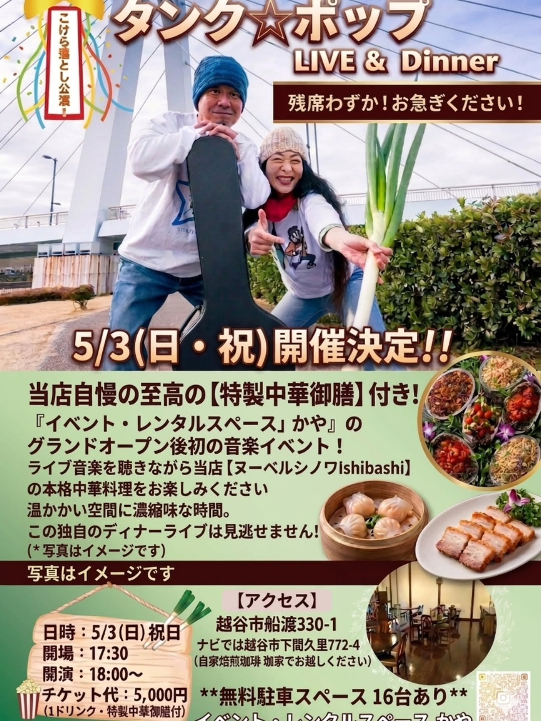 5月3日(日・祝)、せんげん台駅近く、イベント・レンタルスペース「かや」で「タンク★ポップ LIVE & Dinner」を開催します!🎶